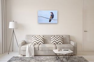 A realistic rendering by artist Emil Morhardt of a calm but vigilant crow on a powerline in the early morning sun. The bird is painted against a foggy blue sky gazing out into the distance. Ã’There was something peaceful about one of this often-raucous species taking a break from his noisy comrades, says Emil. He's just surveying the scene for a few minutes before rejoining them.
