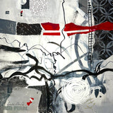 Artist Linda Shaffer drew inspiration from the joy of traveling, climbing, and discovering new hiking trails to create this mixed-media abstract artwork. The collage of different types of paper, monoprints, and photographs creates texture while bold mark-making adds movement. The red accents contrast the dominating black and grey palette.