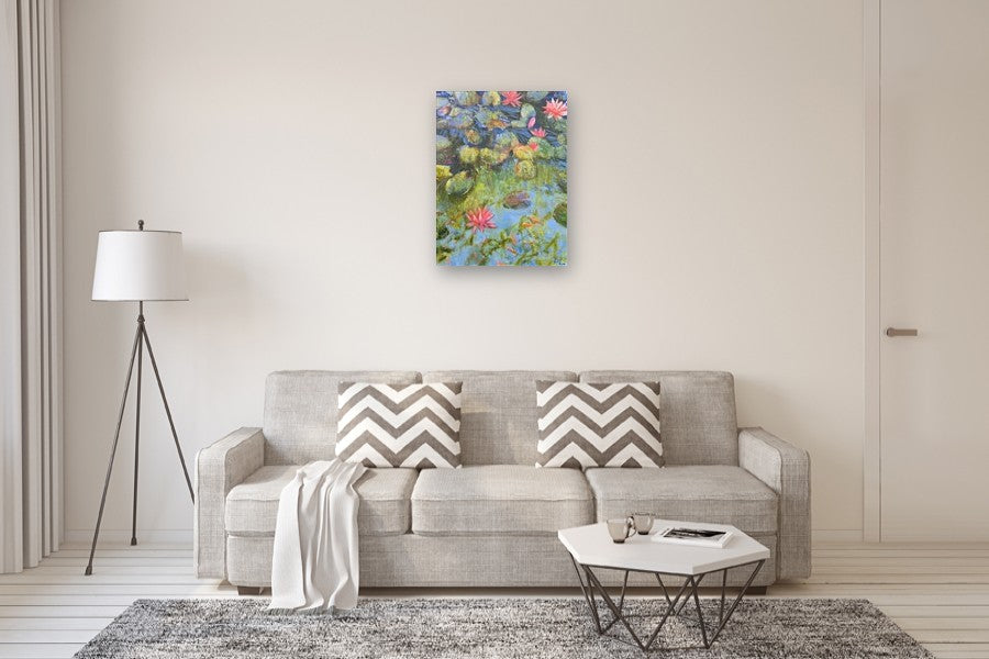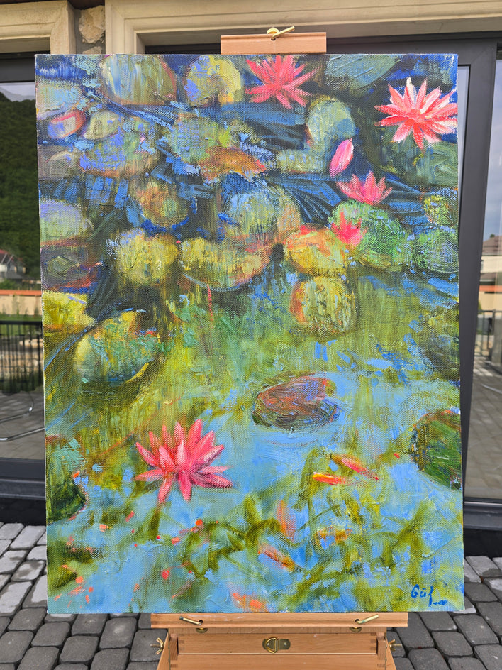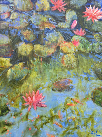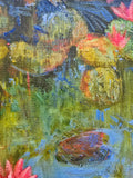 Flowers and water lilies float on still water, creating a dreamlike aquatic setting. The expressive brushwork and layered textures create a sense of both movement and serenity. It captures the beauty of a tranquil and otherworldly moment.