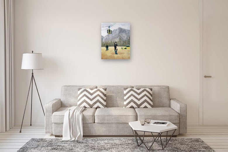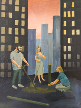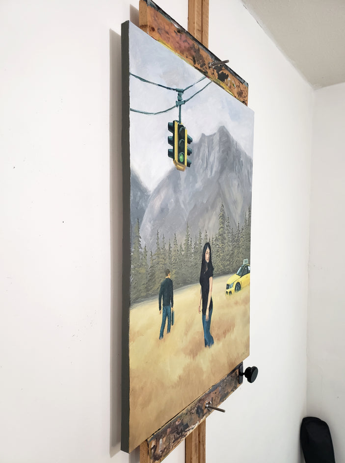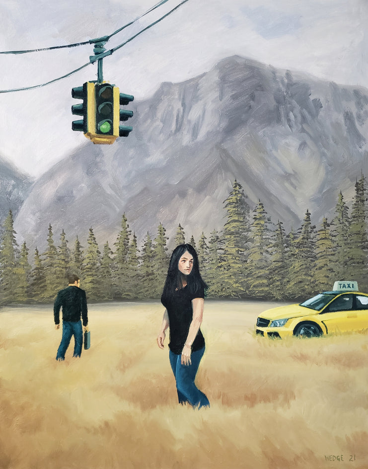 "Figures move through a surreal landscape occupied by elements from the city and the countryside," explains artist Michael Wedge. Michael creates a curious juxtaposition of everyday city street life and sprawling nature. People move about as if through normal traffic, with a yellow taxi's tires submerged in tall dry grass.