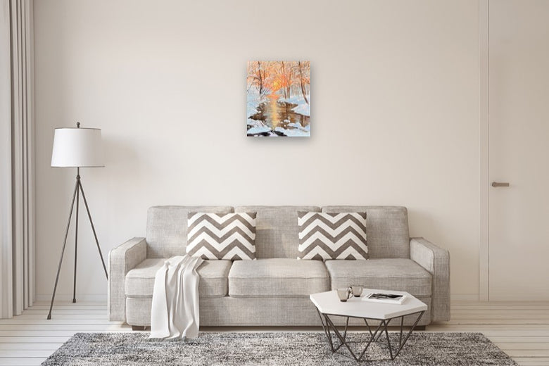 A gentle river winds through a golden woodland, where warm sunlight filters through frosted branches and reflects off the icy banks. The glowing tones of amber, soft white, and muted blue create a delicate balance between warmth and stillness. This peaceful winter landscape invites the viewer to pause and feel the hush of snow, the shimmer of light, and the quiet poetry of nature in its most tender season.