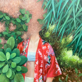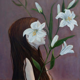 A young woman looks off to the right, her face hidden by a blooming lily. Her flowing hair matches the stems of the flowers. This is one of three paintings from my Lilium series inspired by these beautiful flowers, explains Agnieszka. I wanted to create an aura of mystery and prompt the question: what secrets does the woman hide?