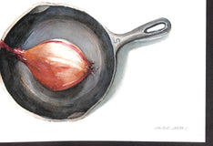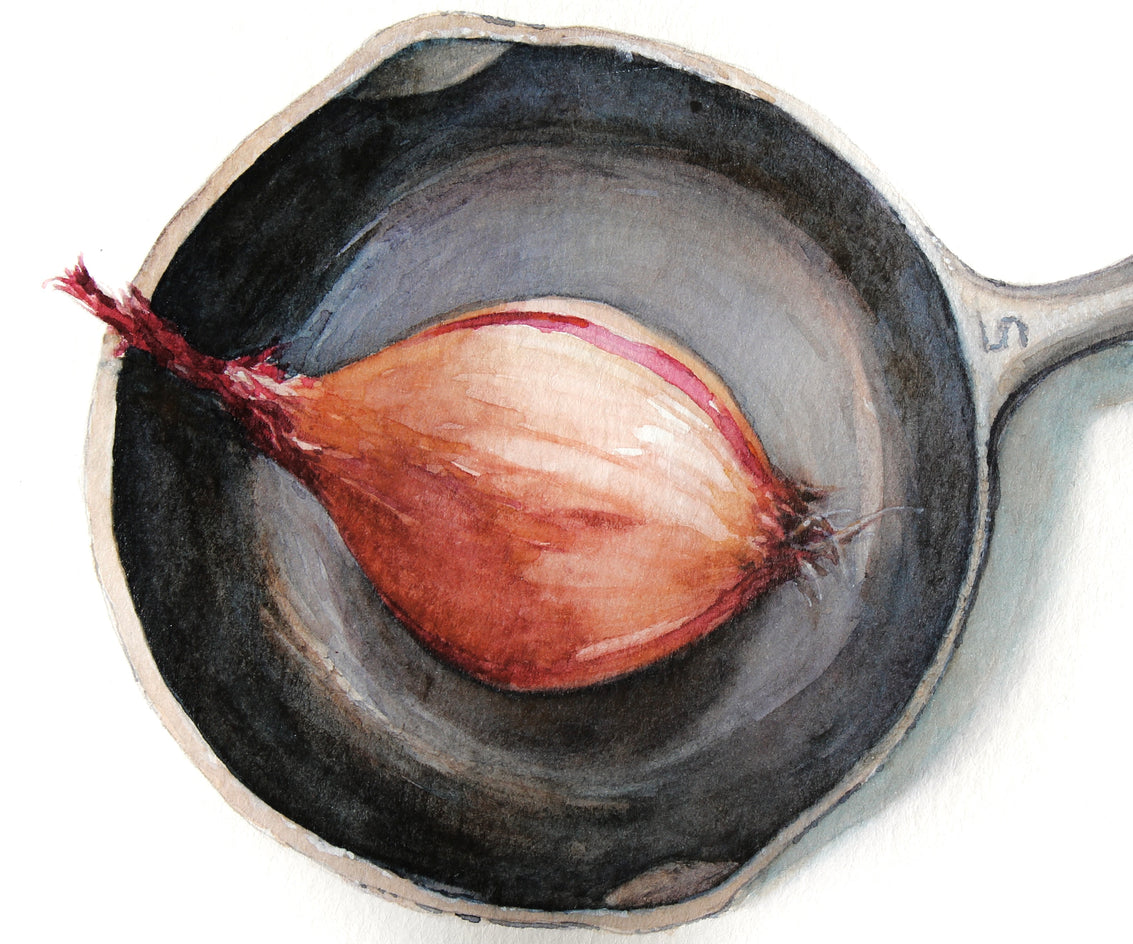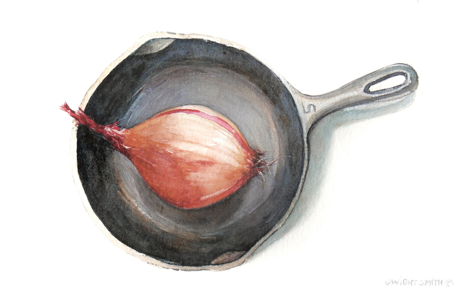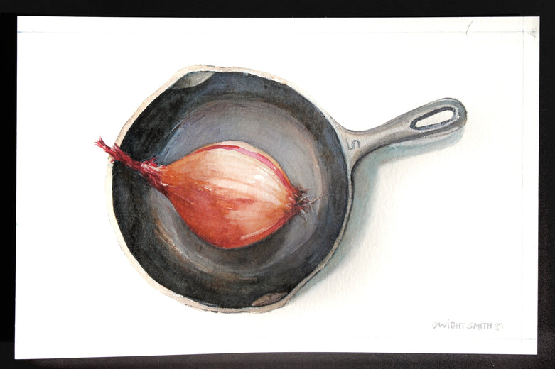 Artist Dwight Smith presents a culinary still life painted in the realist tradition. "My mom gave my wife and me several cast iron skillets," shares Dwight. "This small skillet is a number 5." He highlights the simplicity in his pastoral piece. The splash of color from the shallot against the many subdued hues within the pan makes for the work's main focal point.