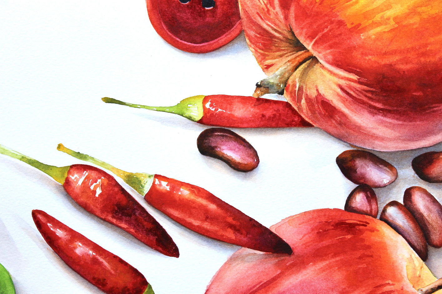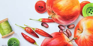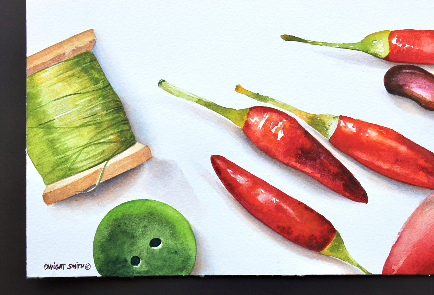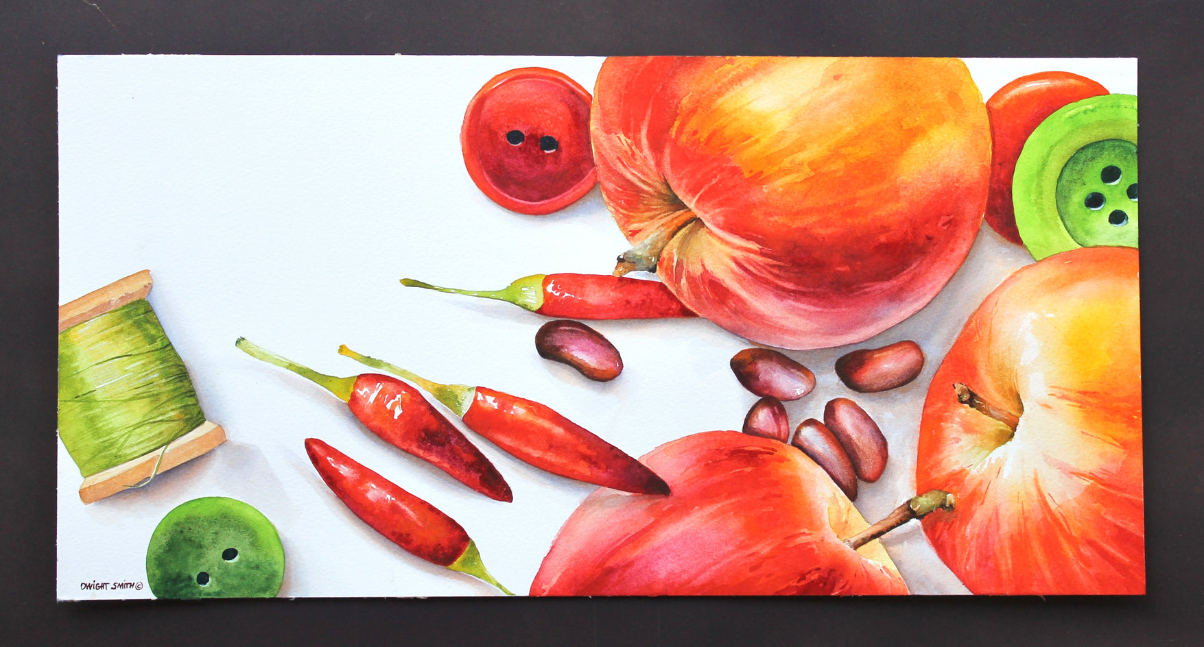Artist Dwight Smith paints a realistic still life of a collection of red and green items. Apples, chillis, beans, buttons, and a spool of thread lay on a white surface. "How can I get the observer to look right to left viewing this watercolor?" asks Dwight. He arranges the objects with purpose, using different hues and changing values to entice the viewer to start at the right frame of reference.